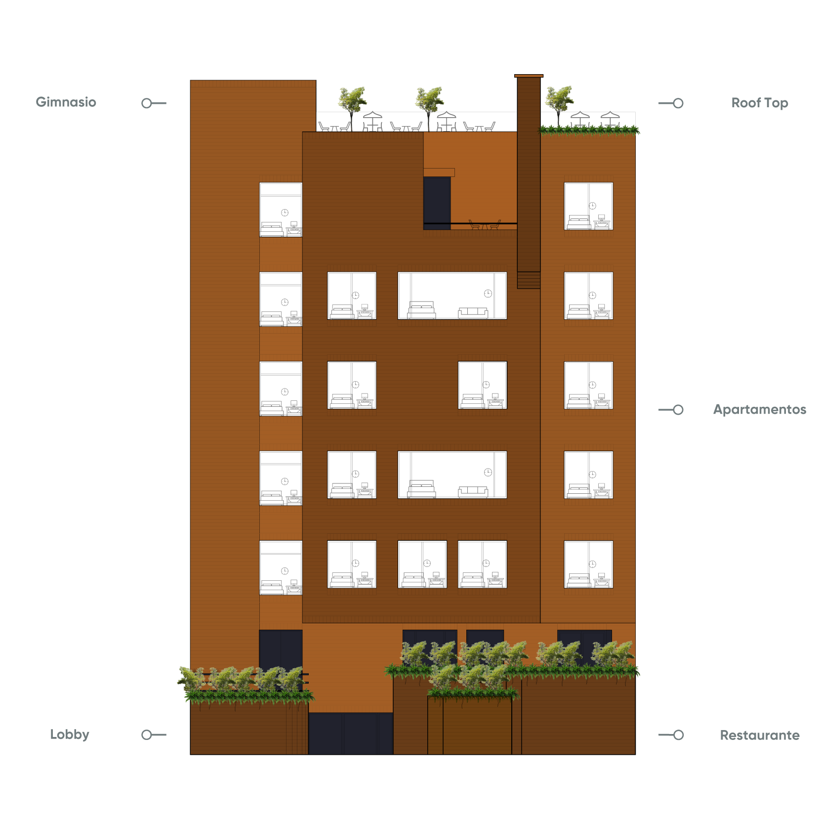 Plura Nogal, es un edificio de reconversion que cuenta con 45 apartamentos amoblados, restaurante, café bar, coworking, salas de juntas y Roof Top con BBQ.