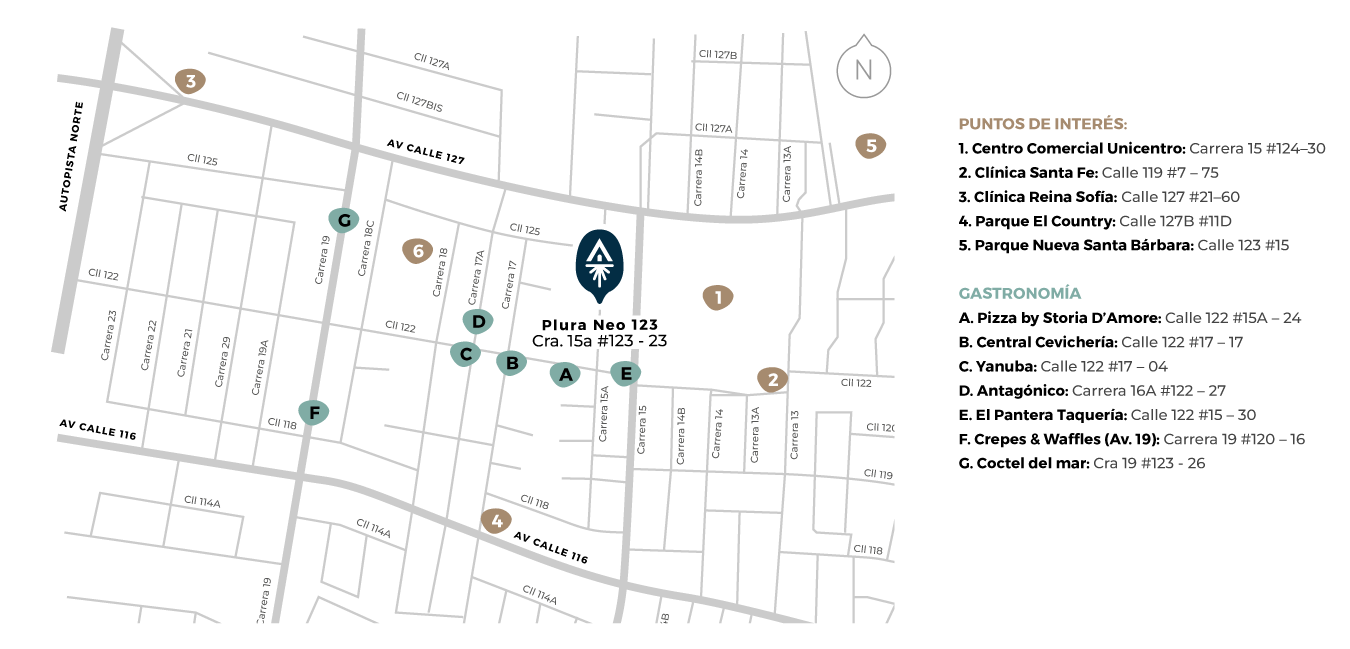 Ubicado en una de las zonas más exclusivas del norte de Bogotá, Plura 123 te ofrece una ubicación privilegiada en el corazón de Santa Bárbara. A pocos pasos de centros comerciales, clínicas de primer nivel, parques y una destacada oferta gastronómica y cultural. Todo lo que necesitas para vivir con comodidad, conexión y tranquilidad, en un solo lugar.